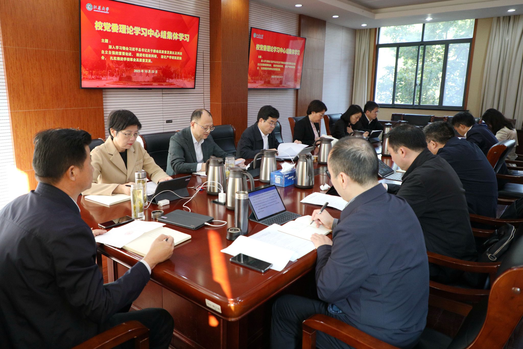 10月23日,校党委理论学习中心组在行政一号楼201会议室围绕习近平总书记关于高质量发展及科技自立自强重要论述开展集体学习。在校校党委理论学习中心组成员参加学习,集体学习由校党委书记李洪波主持。
