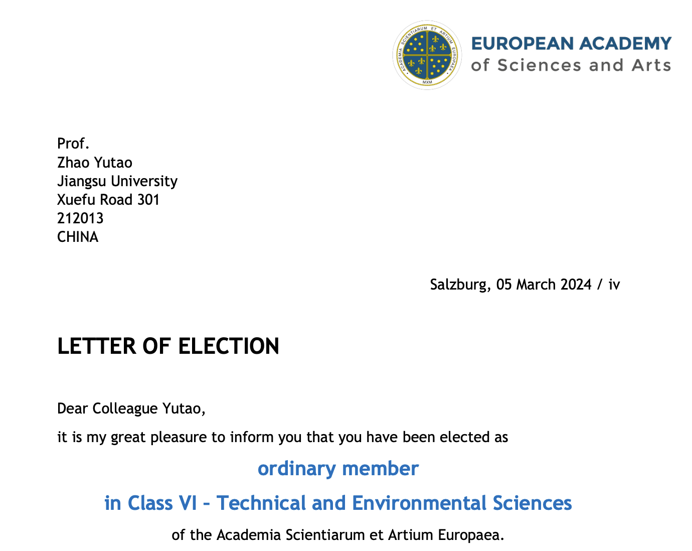 近日,欧洲科学与艺术院(European Academy of Sciences and Arts)院长Prof. Klaus Mainzer发来贺信:经理事会投票,大发在线材料科学与工程学院赵玉涛教授当选欧洲科学与艺术院院士(技术与环境科学学部)。
