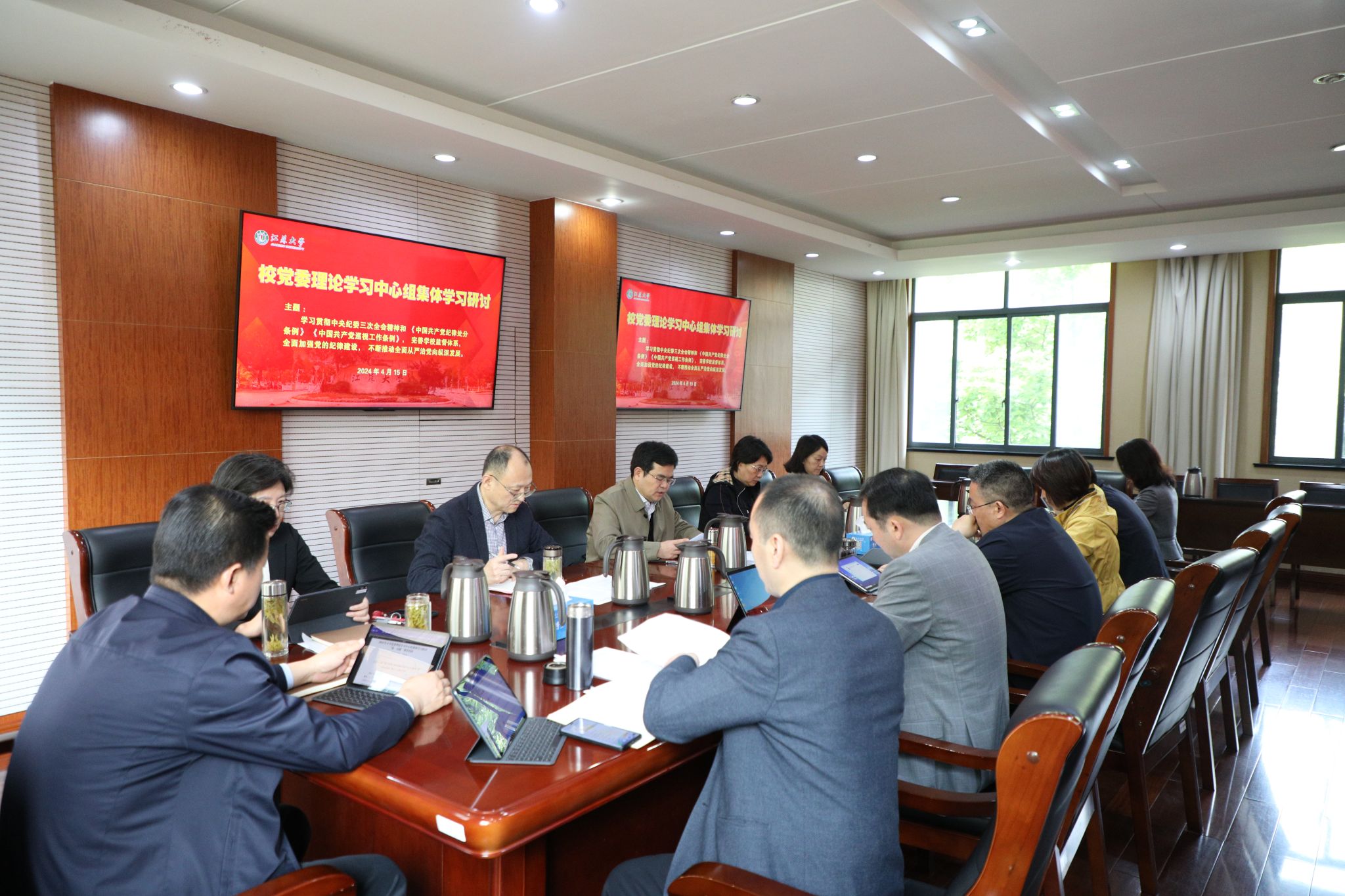 4月15日,校党委理论学习中心组在行政一号楼201会议室围绕学习贯彻二十届中央纪委三次全会精神和《中国共产党纪律处分条例》《中国共产党巡视工作条例》开展集体学习研讨。在校校党委理论学习中心组成员参加学习,集体学习研讨由校党委书记李洪波主持。