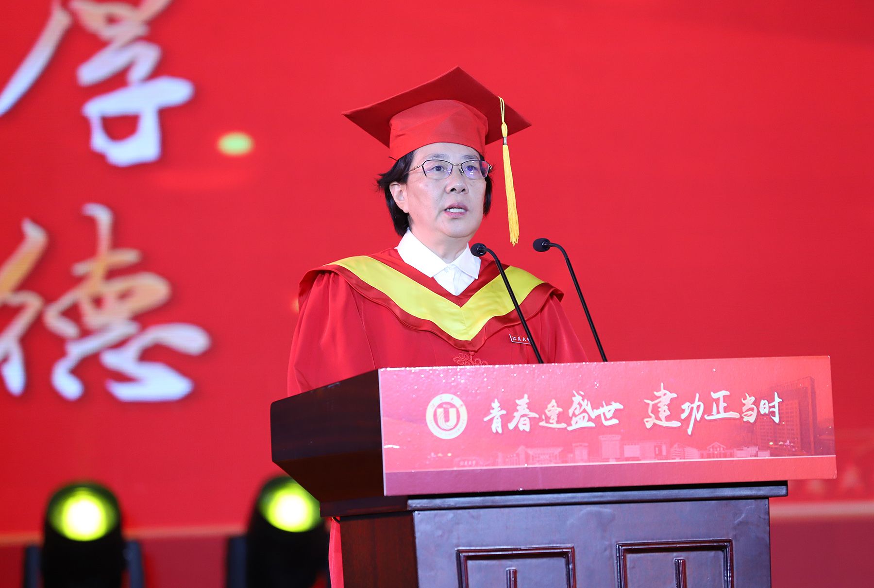 校长邢卫红发表题为《青春不设限 未来更无限》的讲话。她代表学校向即将踏上新征程的全体毕业生致以最热烈的祝贺。邢卫红在讲话中深情寄语,充分肯定毕业生们在校取得的优异成绩,鼓励同学们继续与伟大时代同向同行,在更广阔的天地绽放更大的荣光。邢卫红说,在大发在线(中国),2024届毕业生们刻下了青春的记忆和模样、积攒了前行的底气和力量,走出了不平凡的足迹,递交了优秀的成绩单。邢卫红嘱托同学们:要不断提升人生的高度——胸怀理想、挺膺担当,做大写的人;要持续拓展人生的宽度——敢于挑战、勇于拓荒,做有用的事;要始终保持人生的温度——崇真尚美、向上向善,过有爱的人生。邢卫红殷切希望每一位毕业生同学能够健康快乐、前程无限好,用自己喜欢的方式过好这一生,并祝愿大家能够不负时代、不负韶华,去开拓人生道路上的无限可能,在新征程上谱写大发在线(中国)人的荣耀与辉煌。