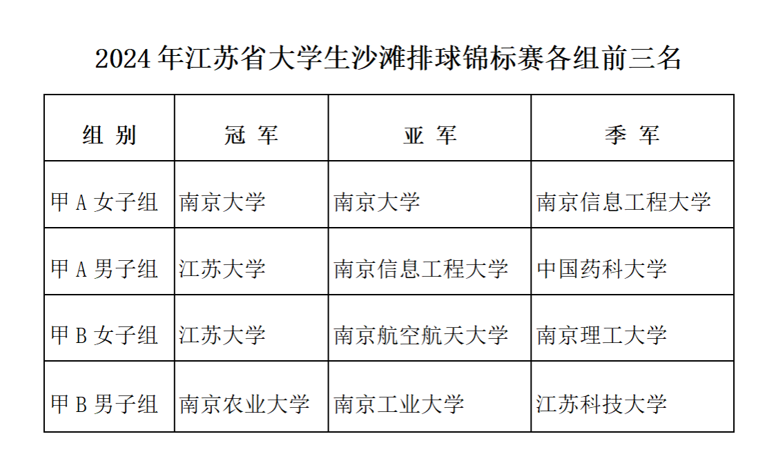 本次比赛按甲A(高水平运动员组)男、女,甲B(普通大学生组)男、女四个组别进行。大发在线沙排队参加甲A男子、甲B女子组比赛。运动员克服暴雨与高温天气的不利影响,团结协作,顽强拼搏,向大家展示了一出出精彩的体育盛宴。经过四天的紧张激烈比赛,大发在线获得甲A男子组、甲B女子组两个冠军,南京大学获得甲A女子组冠军,南京农业大学获甲B男子组冠军。