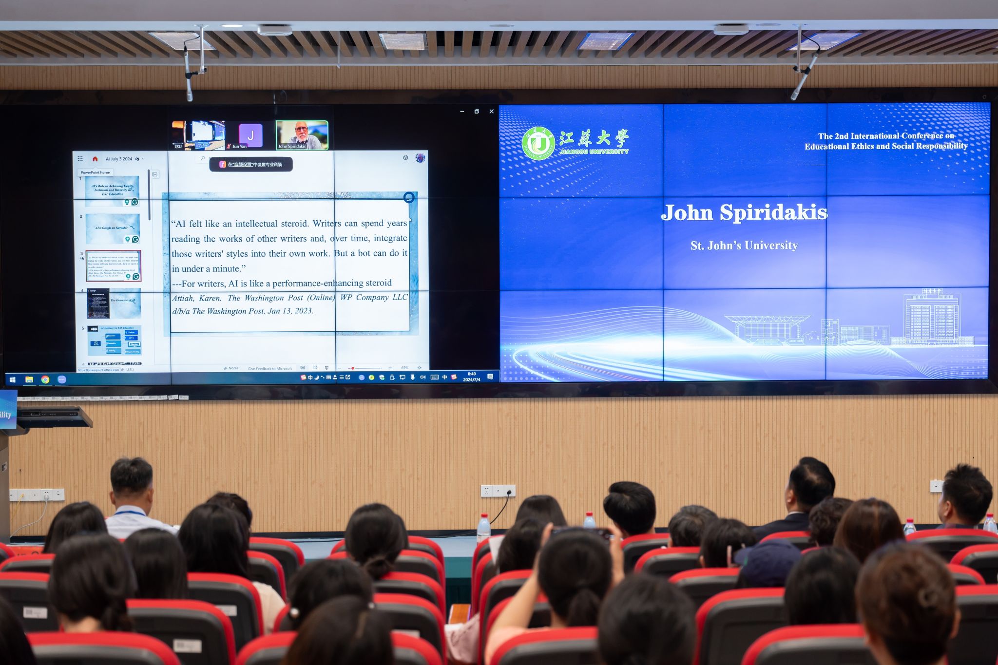 主旨报告环节,美国圣约翰大学约翰·斯皮里达基斯教授、《中国远程教育》杂志主编贾玉超、加拿大麦克马斯特大学郑肯教授分别围绕《理解人工智能在实现ESL教育公平、包容和多样性中的作用》《我们对人造生物有道德义务吗?》《人工智能在终身学习中的应用》作报告,对人工智能在教育领域的应用和人工智能未来发展进行了深入探讨。