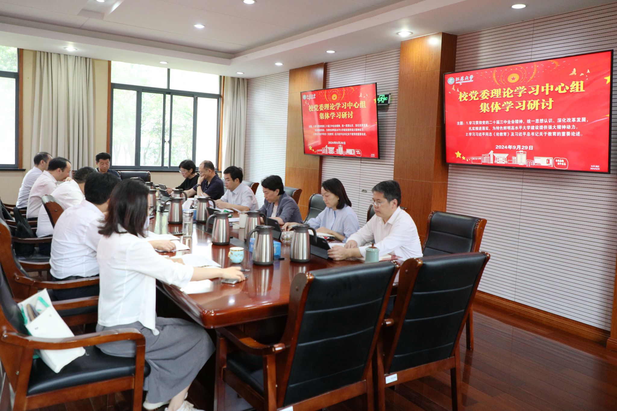 9月29日,校党委理论学习中心组在行政一号楼201会议室围绕学习贯彻党的二十届三中全会精神、全国教育大会精神、习近平同志《论教育》以及习近平总书记关于教育重要论述等内容开展专题学习研讨。在校校党委理论学习中心组成员参加集体学习研讨,集体学习研讨由校党委书记李洪波主持。