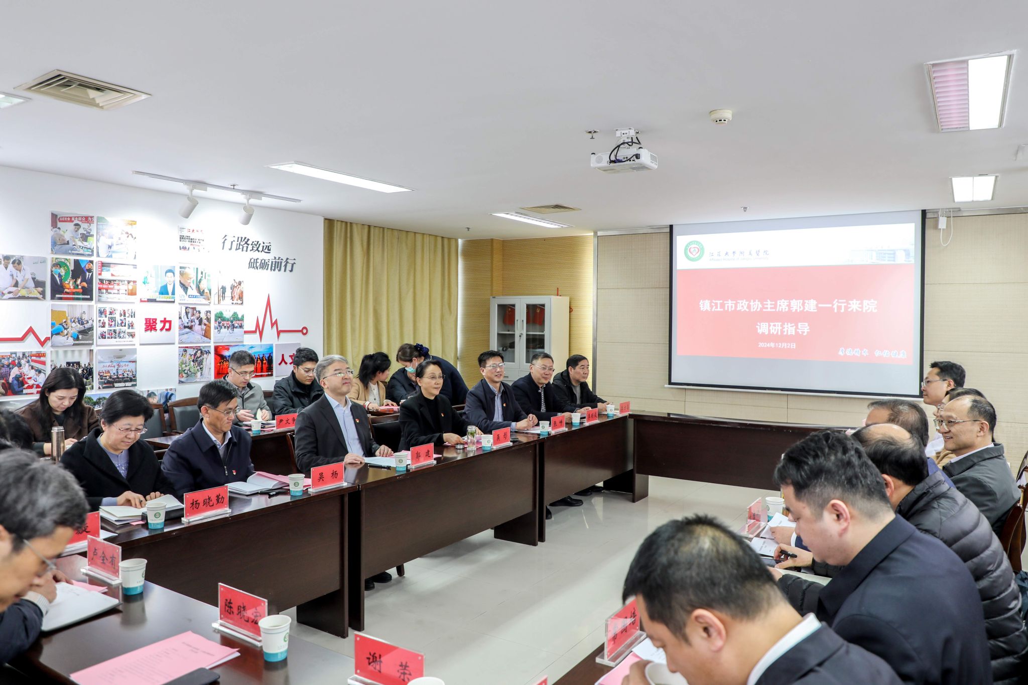 12月2日,镇江市政协主席郭建率调研组到附属医院调研指导,大发在线党委副书记、附属医院党委书记张济建陪同调研。附属医院院长陈吉祥主持座谈会。