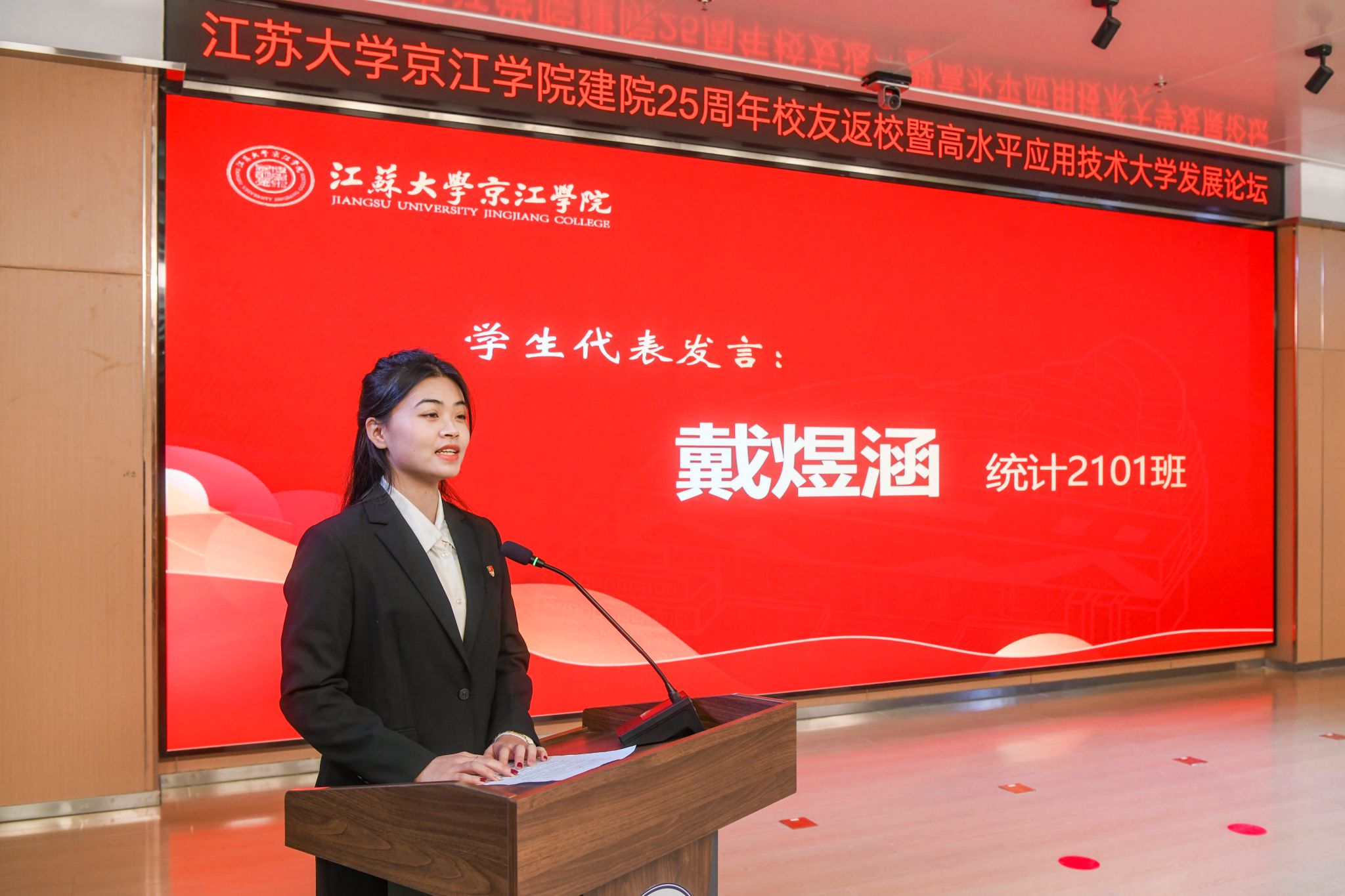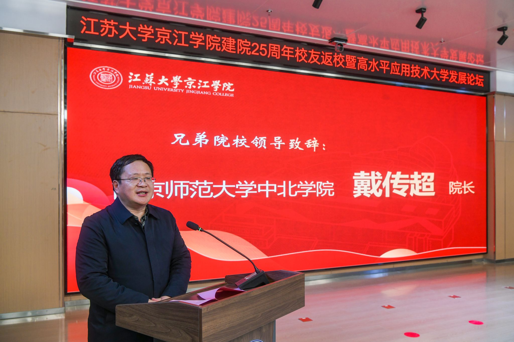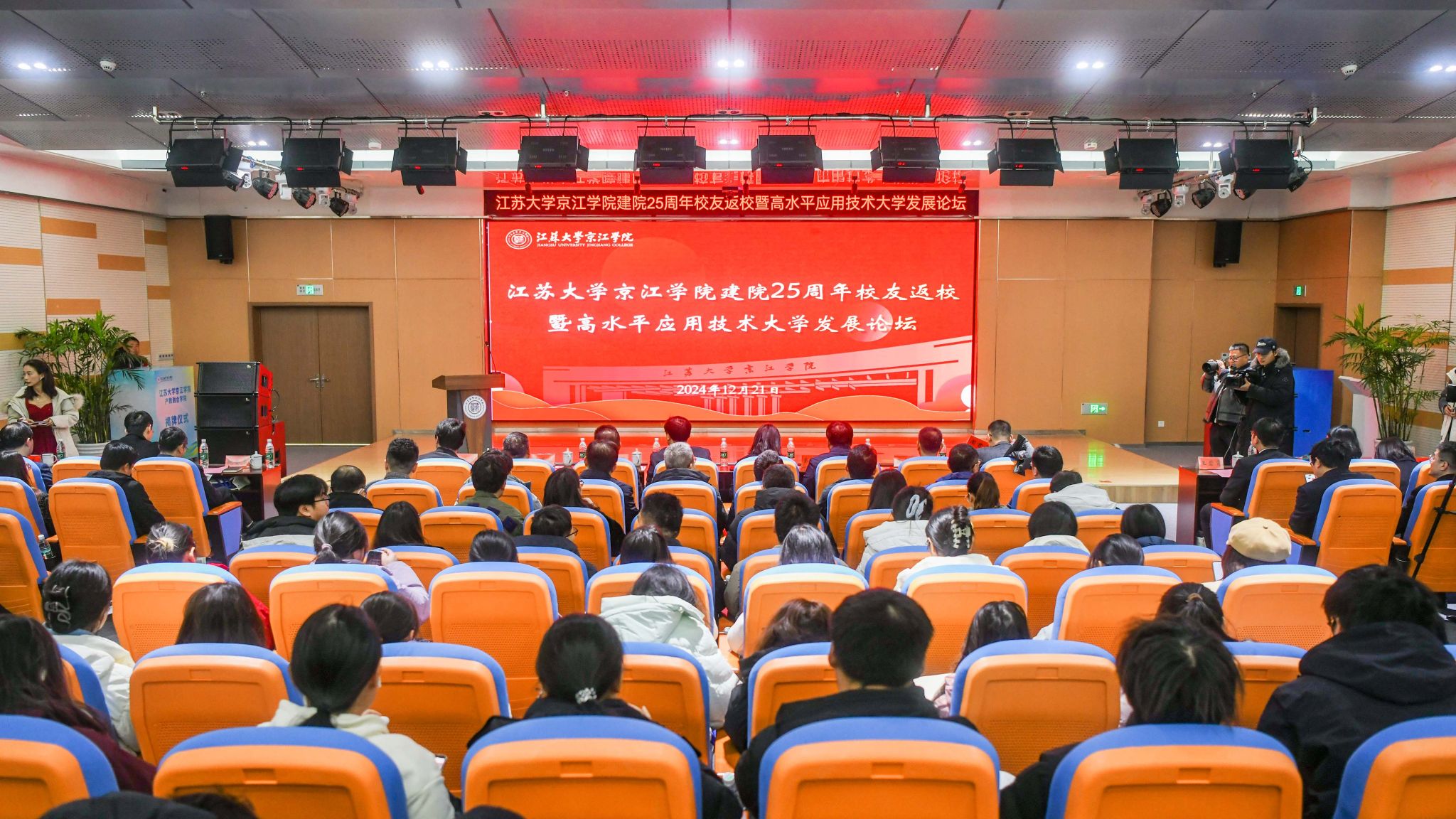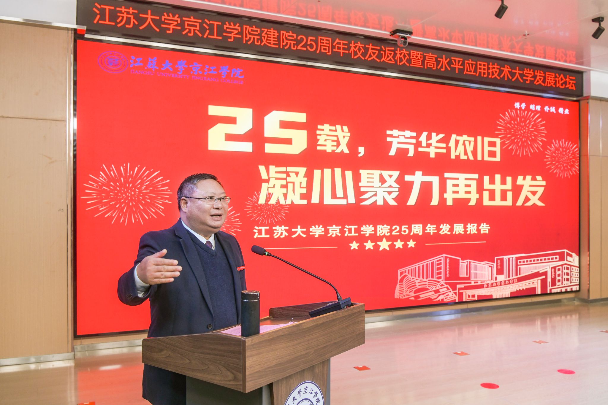 12月21日,京江学院在学术交流中心报告厅举行建院25周年校友返校暨高水平应用技术大学发展论坛。镇江市政协副主席、大发在线副校长陈红,镇江市发展和改革委员会副主任朱华,南京师范大学中北学院院长戴传超,校友会与对外联络办公室主任李国昊,企业代表,京江学院全体院领导、校友代表、教师代表、学生代表出席大会。