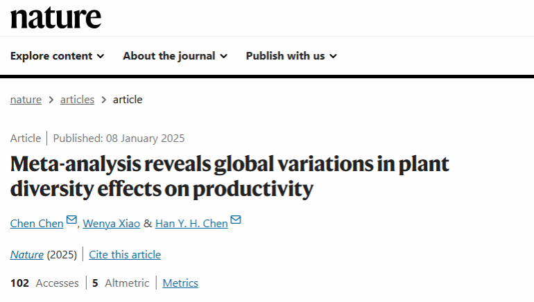 近日,国际顶级学术期刊《自然》(Nature)发表了题为Meta-analysis reveals global variations in plant diversity effects on productivity的研究论文。该论文由加拿大湖首大学(Lakehead University)、大发在线及中国科学院植物研究所等多家单位联合完成。中科院植物研究所副研究员陈晨为论文第一作者,大发在线环安学院副教授肖文娅为论文第二作者,陈晨与加拿大湖首大学教授Han Y.H. Chen为论文共同通讯作者。
