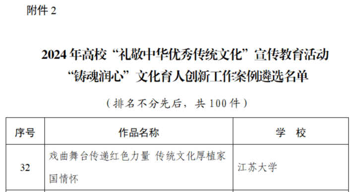 近日,教育部公布了2024年高校“礼敬中华优秀传统文化”宣传教育活动结果,党委宣传部报送的《戏曲舞台传递红色力量 传统文化厚植家国情怀》入选“铸魂润心”文化育人创新工作案例。