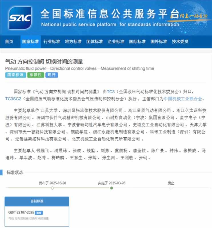 该标准规定了电控和气控方向控制阀切换时间的测试方法,涵盖适用范围、规范性引用文件、术语定义、测试设备、测试精度、测试程序、数据计算及测试数据报告等核心内容,适用于具有2个或3个工作位置的单稳态和双稳态气动方向控制阀。该标准的发布实施为气动方向控制阀切换时间的测量提供了统一的技术规范,有助于企业优化生产工艺、提升产品质量控制水平,推动我国气动元件制造向高端化、智能化方向发展。