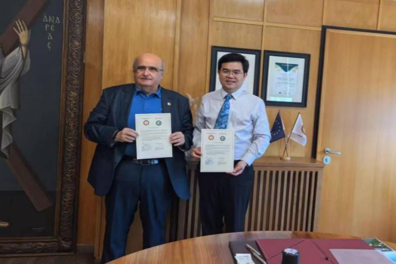6月23日,代表团首站访问希腊帕特雷大学(University of Patras),与校长克里斯托斯•布拉斯(Christos Bouras)、学术与国际事务副校长迪奥尼修斯•曼察维诺斯(Dionissios Mantzavinos)举行会谈。双方正式签署合作意向书,致力于创建“一带一路”智慧农业技术与装备国际联合实验室,同步启动学生互换交流与境外办学项目,标志着中希高校合作迈入深度融合新阶段。当日,代表团还拜访了历史悠久的希腊雅典科学院,美国国家工程院院士、希腊科学院院士、希腊雅典国立技术大学化学工程教授Doros Nicolas Theodorou等热情接待。双方就开拓科技合作渠道、促进大发在线与希腊雅典科学院开展技术交流、高层次人才引进与输出达成共识。