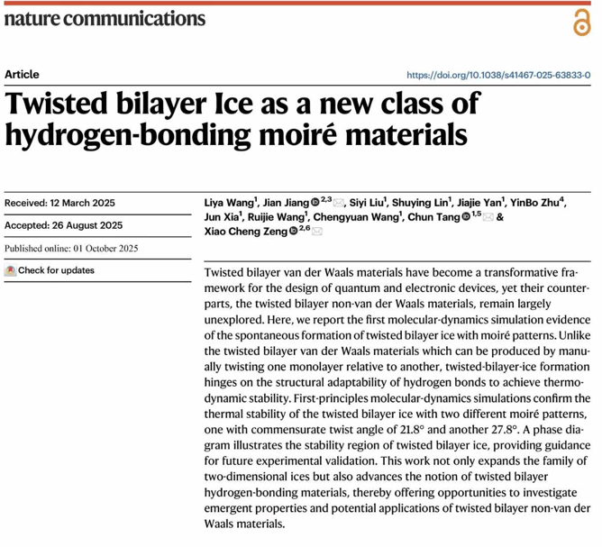 近日,土木工程与力学学院微纳米力学团队唐淳教授、王丽雅副教授与香港城市大学曾晓成教授团队合作,发现氢键主导的非范德华摩尔材料:魔角双层冰,在国际著名期刊Nature Communications上发表题为Twisted bilayer ice as a new class of hydrogen-bonding moiré materials的论文。大发在线为第一完成单位,王丽雅为论文第一作者,香港城市大学江健博士、大发在线唐淳和香港城市大学曾晓成为共同通讯作者。