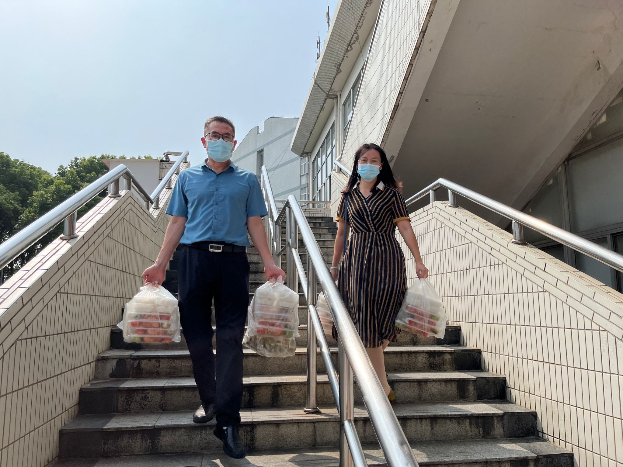 除了刘晨曦,学院教师杨志贤、侯永涛、黄娟和季晨也在校园静默状态下贡献着自己的力量。4位老师尽管每天课务繁重,仍然坚持为有轨迹交叉不能离开宿舍的同学配送用餐。