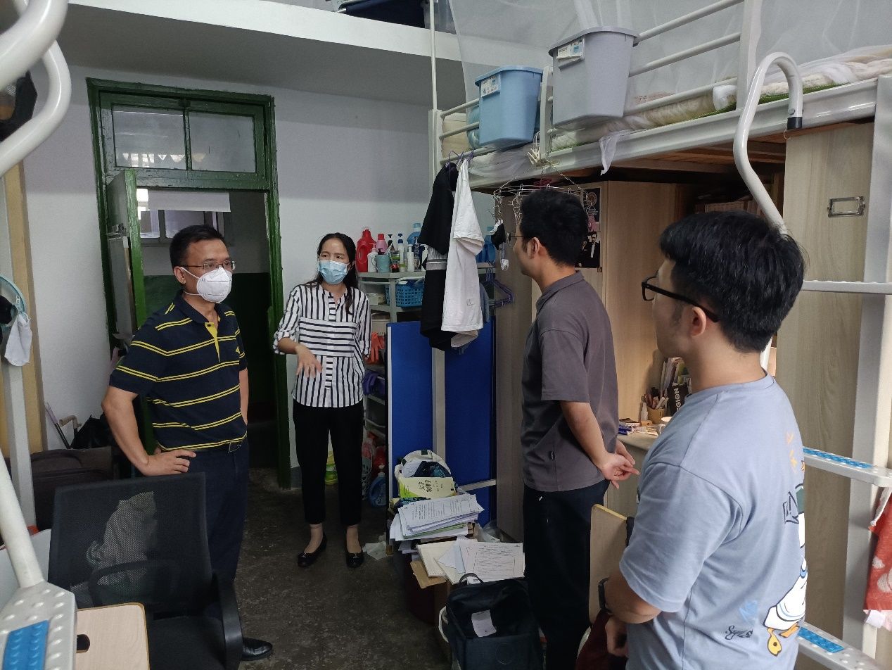 在C区1栋19级男生宿舍,老师们叮嘱同学时刻关注学校有关疫情防控的要求和通知,每天按时健康打卡,按照要求完成核酸检测。了解到19级大部分学生正在备战考研,陈元平勉励他们,“越是在艰难的时刻,越要坚定信心,相信自己,星光不问赶路人,时光不负有心人,一切努力终有收获!”同学们也纷纷表示,会积极克服因疫情导致的短暂不便和困难,心无旁骛,在宿舍也会拼尽全力、冲刺备考。