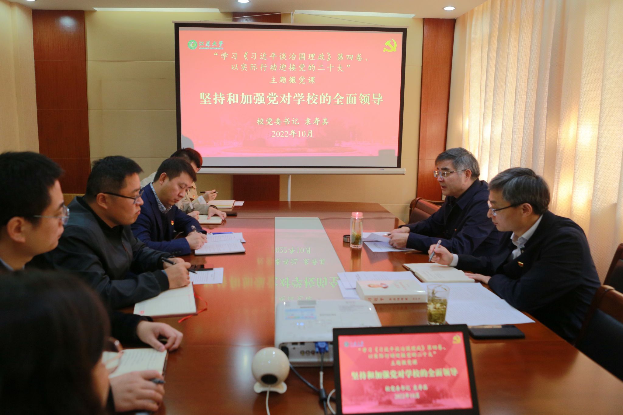 10月14日上午,党委办公室党支部开展“学习《习近平谈治国理政》第四卷 以实际行动迎接党的二十大”主题党日活动,校党委书记袁寿其以党员身份参加活动并作题为《坚持和加强党对学校的全面领导》的党课。