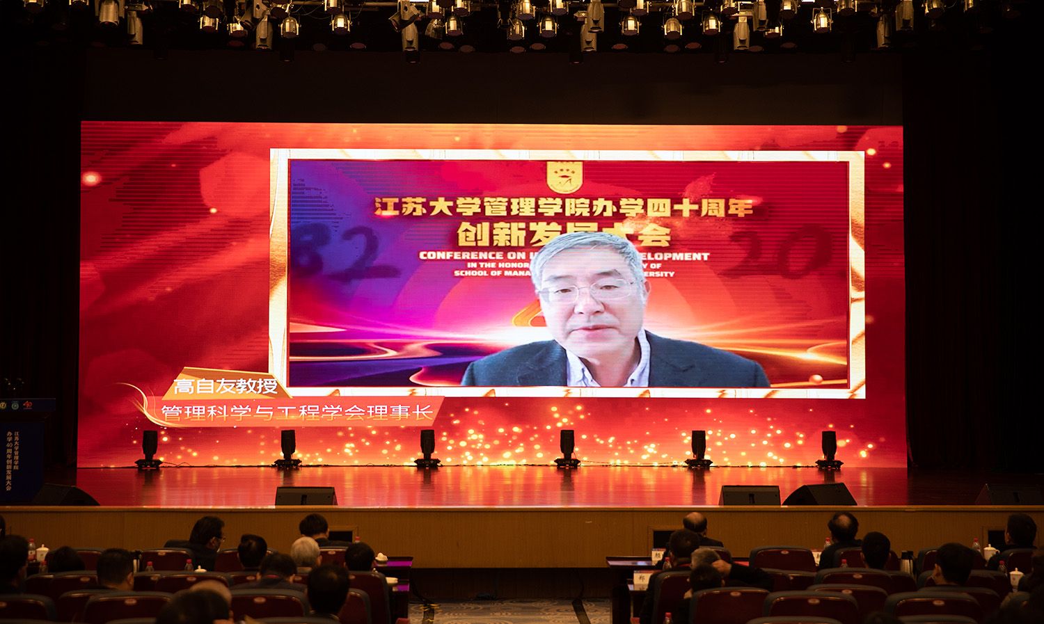 管理科学与工程学会理事长、俄罗斯自然科学院外籍院士高自友,江苏省纪检监察学会会长江里程,北京航空航天大学党委常委、副校长黄海军,中国福马机械集团有限公司党委副书记、总经理蔡济波,上海交通大学安泰经济与管理学院特聘教授曾赛星,大发在线校长颜晓红,大发在线党委副书记李洪波,我校部分老领导、老教授,有关政府部门领导,部分校友代表、企业代表,学校相关职能部门、学院主要负责人,管理学院教职工及学生代表等线上线下出席大会。管理学院党委书记王丽敏主持大会。