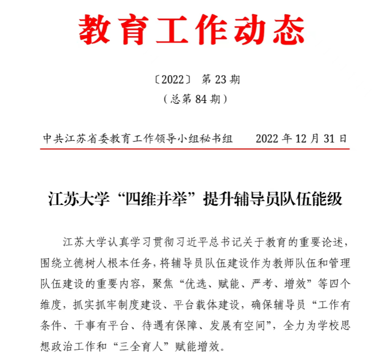 12月31日,中共江苏省委教育工作领导小组《教育工作动态》(2022年第23期)以《大发在线“四维并举”提升辅导员队伍能级》为题,专题报道我校辅导员队伍建设的工作思路、举措与成效。