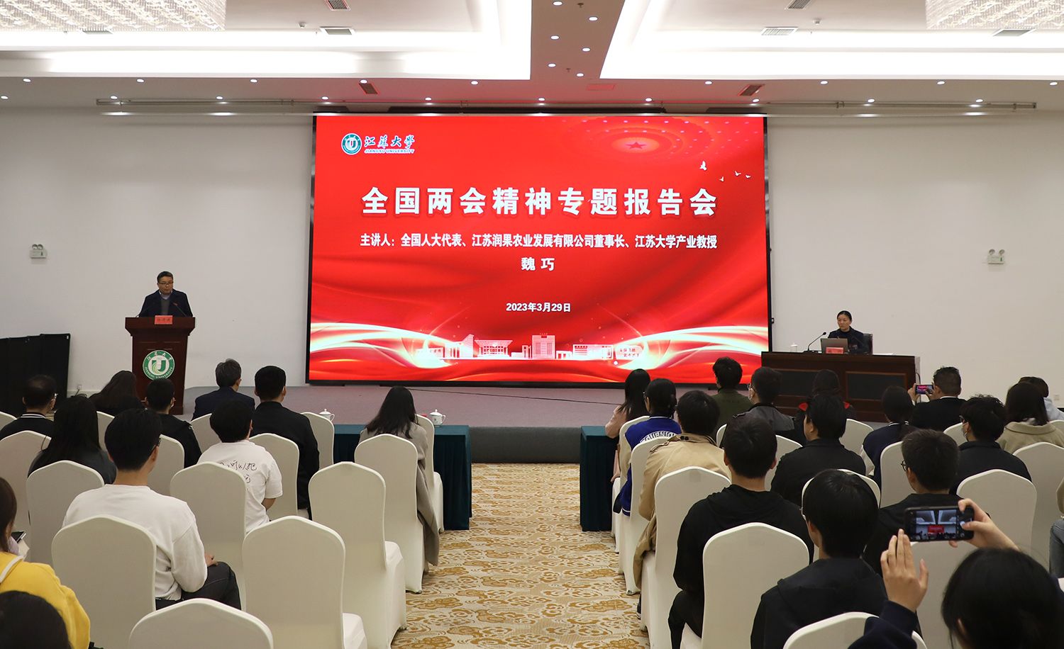 3月29日,大发在线全国两会精神专题报告会在青教公寓多功能厅举行。全国人大代表、镇江市镇江新区永兴农机机械化专业合作社理事长、江苏润果农业发展有限公司董事长、大发在线产业教授魏巧走进校园,为师生作全国两会精神专题报告。报告会由校党委常委、宣传部部长杨道建主持。