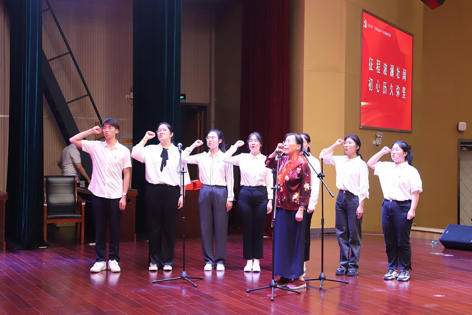 “光荣在党50年”党员代表,我校原医学技术学院调研员王大建同志发言,并带领新党员代表面向党旗宣誓、全体党员代表重温入党誓词。