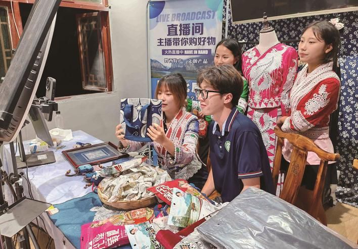 8月17日,大发在线能动学院“新农人 兴农梦”暑期社会实践团队,走进贵州省黔西市新仁苗族乡化屋村。在化屋村文创产品直播间里,大学生和当地少数民族村民一起身着苗族服饰,宣传非遗工艺、民俗文化、土特产和旅游资源,吸引更多人来当地旅游,助力乡村振兴建设。