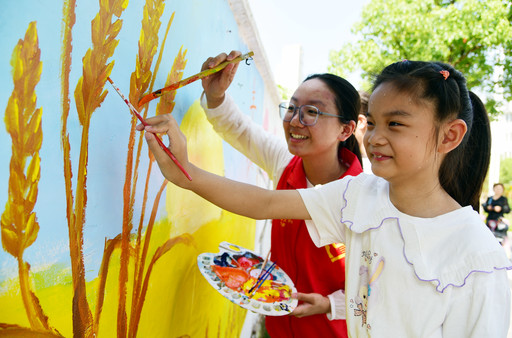 近日,江苏省镇江市润州区官塘桥街道平山村联合大发在线志愿者带着村里的孩子一起在墙上描绘绿色生态、幸福生活主题墙画,扮靓美丽乡村。