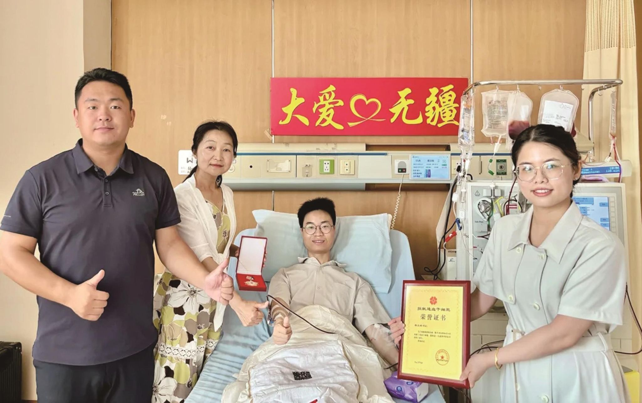 病房里,药学院的老师为蒋文昭送上祝福鲜花,镇江市红十字会授予他“博爱勋章”和捐献造血干细胞荣誉证书,表达对他的敬意。蒋文昭还收到了患者家属委托志愿者带来的感谢信,感谢他拯救生命,为一个家庭带来重生的机会。