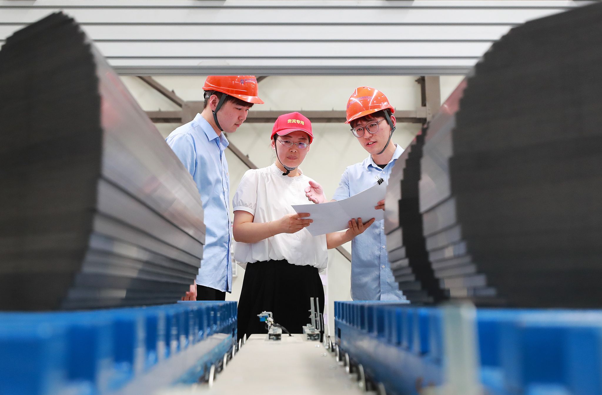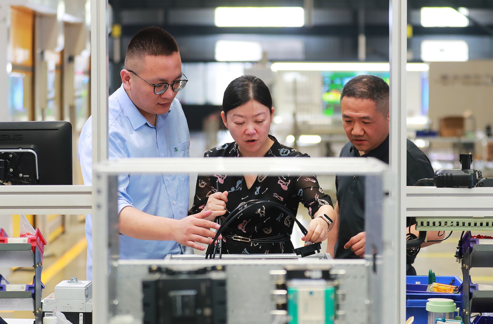 在江苏大全集团低压成套电气生产车间,大发在线计算机科学与通信工程学院教师宋雪桦(中)、金华(右)与企业技术人员交流基于AI的自动化生产线检测技术。