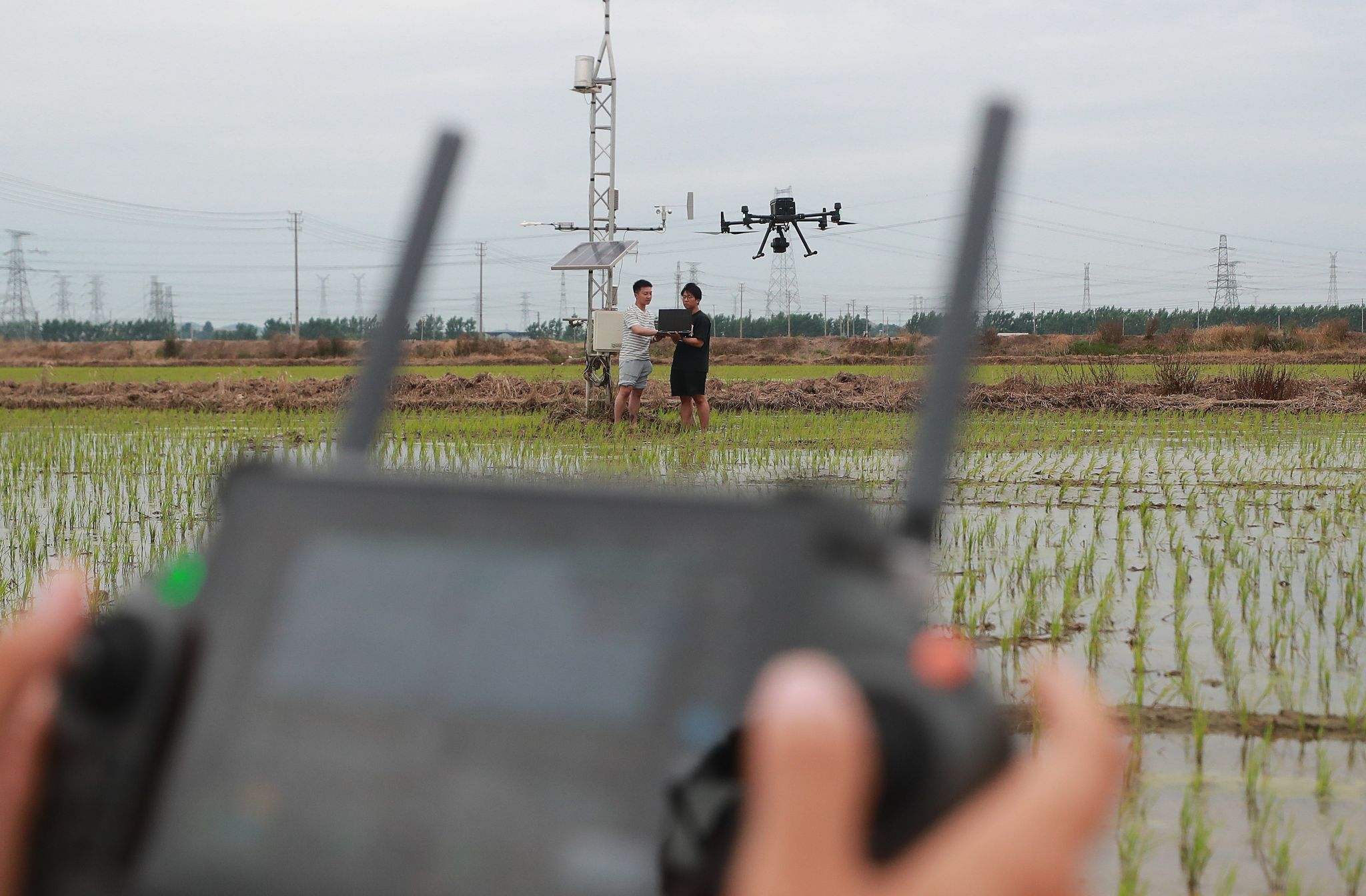 在江苏镇江新区永兴农机机械化专业合作社,大发在线农业工程学院师生利用低空无人机采集大田信息。