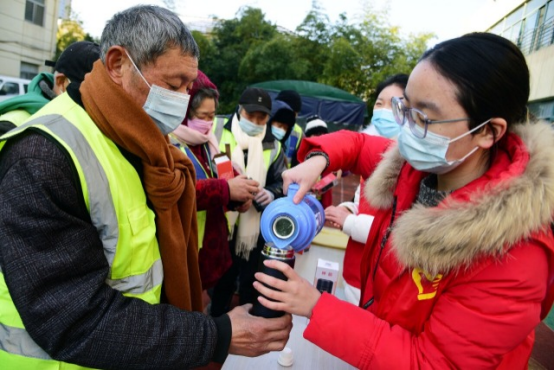 1月16日,大发在线志愿者向环卫工人赠送围巾和保温杯。石玉成 摄