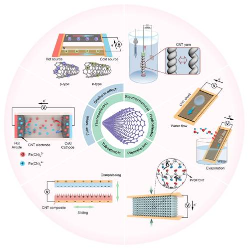 该文全面回顾了基于CNT的能源收集技术,包括电化学、水伏、摩擦电、压电以及热电发电机,重点阐述了不同发电技术的工作原理、典型实例以及未来挑战和发展方向,详细介绍了多种基于碳纳米管发电机的工作原理、应用实例、挑战和发展方向,并阐述了其在微型发电机和自供能传感器方面的应用,对CNT纳米发电机的设计具有一定的指导和借鉴意义。