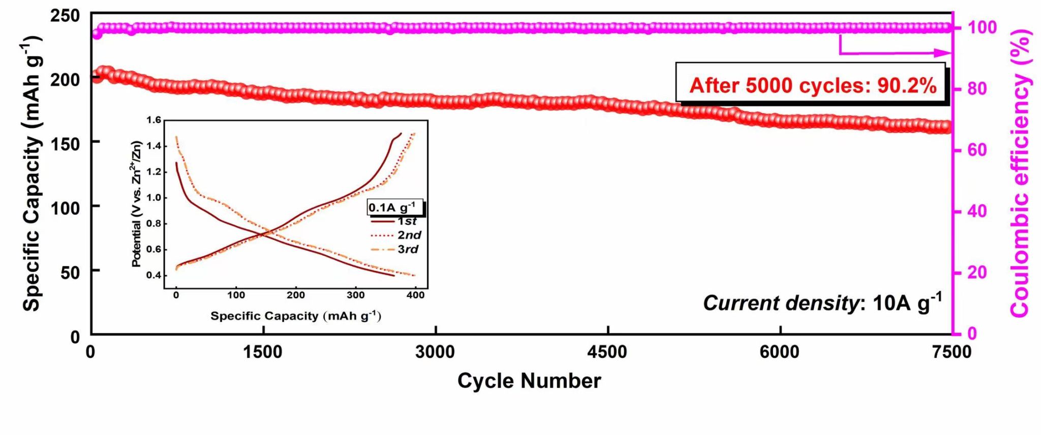 由于三维花状形态以及Mg2+和结构水的共同作用,Zn2+和V-O间的静电相互作用减弱,并构建了额外的离子通道,降低了锌离子迁移能垒。预插层的Mg2+增强了结构的稳定性,并抑制了不可逆脱氨过程,使该材料获得优异的循环稳定性。实验数据表明,适量的Mg2+掺杂可以显著提高NH4V4O10正极材料的放电容量、循环稳定性及倍率性能。改性后的NH4V4O10正极材料,展现出优秀的循环稳定性(在10A g-1电流密度下经过5000次循环后具有90.2%的容量保持率)及良好的倍率性能(25A g-1电流密度下放电比容量达到118mAh g-1)。同时,该研究团队通过采用丰富的表征手段深入研究了镁离子掺杂与形貌调控的作用机理及影响规律,并验证了该材料Zn2+/H2O共插层的储锌机制。