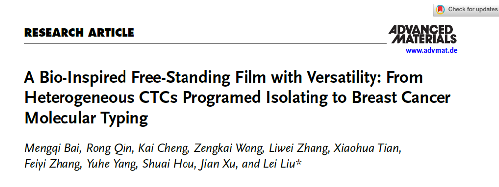 近日,大发在线材料学院博士研究生白蒙起(导师刘磊研究员)以第一作者在国际材料学权威期刊Advanced Materials上在线发表题为“A Bio-Inspired Free-Standing Film with Versatility: From Heterogeneous CTCs Programed Isolating to Breast Cancer Molecular Typing”的研究论文,大发在线为该论文的第一单位和唯一通讯单位。