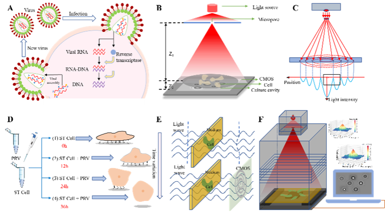 细胞感染病毒状态有效评估是病毒防控、兽药筛选、动植物育种等领域的难点之一。病毒性疾病具有高易变性、高度不稳定性和高传染性,该研究针对目前缺乏快速、高通量和持续监测病毒侵染细胞状态有效手段的问题,以猪伪狂犬病毒为例侵染猪睾丸细胞,通过解析病毒胁迫细胞的光衍射指纹图谱,高通量可视化细胞的病毒感染过程并开发了基于无透镜衍射的病毒胁迫细胞在线定位检测系统。