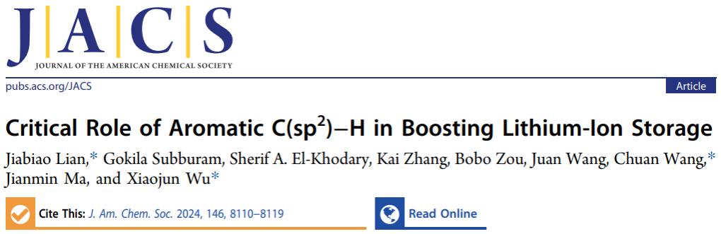 近日,我校能源研究院连加彪研究员团队在化学与材料领域顶级期刊《美国化学会志》(Journal of the American Chemical Society)上发表研究论文“Critical Role of Aromatic C(sp2)−H in Boosting Lithium-Ion Storage”。大发在线为第一完成单位,材料科学与工程学院/能源研究院博士研究生高克拉为学生第一作者,连加彪、南京工业大学王川教授和中国科学技术大学武晓君教授为共同通讯作者。