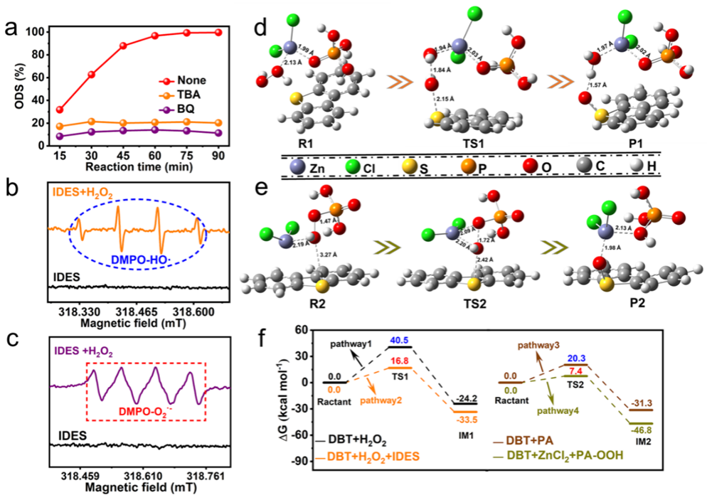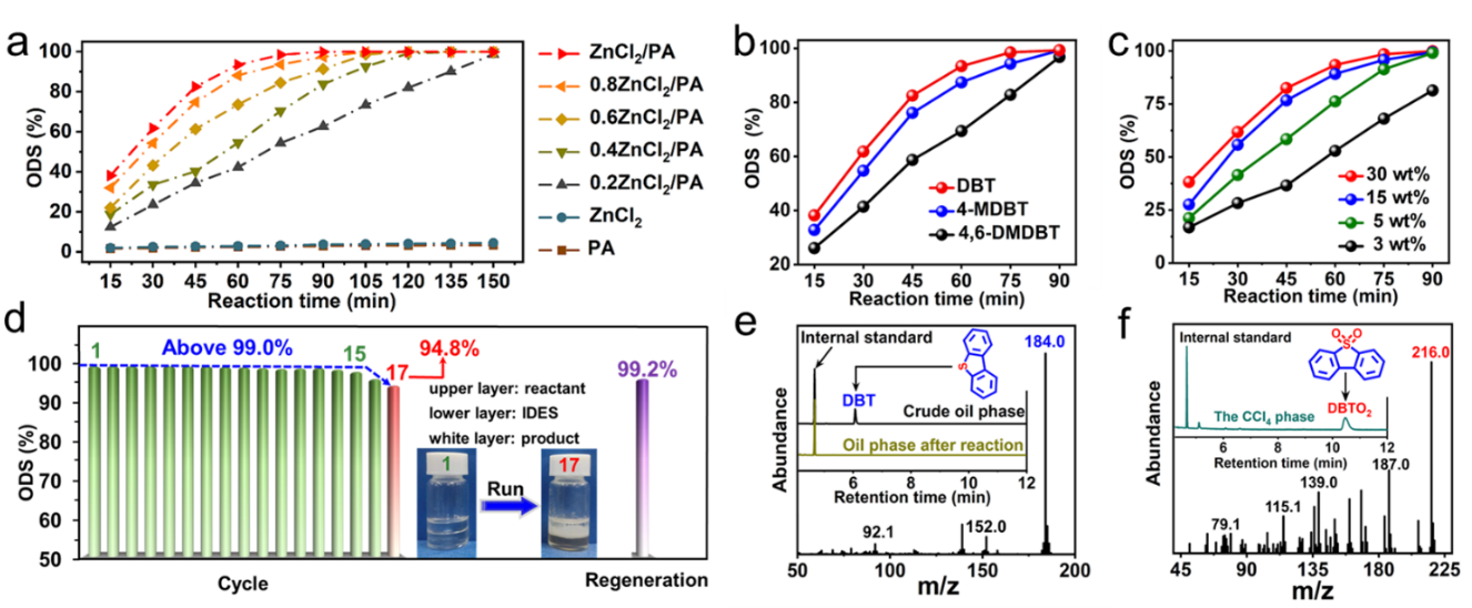 本工作以氯化锌(ZnCl2)和磷酸(PA)为前驱体,通过氢键(Cl···H-O)和配位(Zn···O=P)构建了纯无机低共熔溶剂(IDES-ZnCl2/PA),首次实现了产物自分离的高效液-液界面催化燃油超深度氧化脱硫。