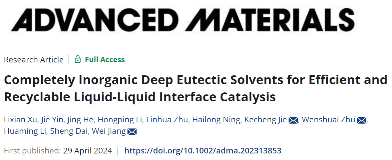 近日,我校能源研究院蒋伟副研究员团队在化学与材料领域顶级期刊《先进材料》(Advanced Materials)上在线发表研究论文“Completely Inorganic Deep Eutectic Solvents for Efficient and Recyclable Liquid-Liquid Interface Catalysis”。大发在线为第一完成单位,能源研究院博士研究生徐丽仙为第一作者,蒋伟、南京大学揭克诚教授与大发在线朱文帅教授为共同通讯作者。
