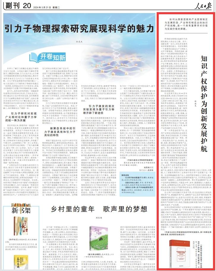 5月21日,北京大学新结构经济学研究院院长,第十四届全国政协常委、经济委员会副主任林毅夫教授在人民日报撰文《知识产权保护为创新发展护航》,向社会各界推荐由大发在线知识产权学院直属党支部书记、新结构经济学知识产权研究院执行院长唐恒教授,以及北京大学新结构经济学研究院学术副院长王勇、赵秋运博士合著的《新结构经济学视角下的中国知识产权战略:理论与案例》一书。