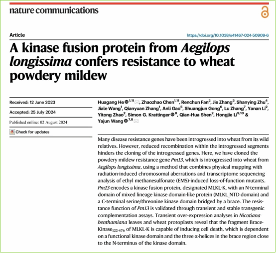 近日,生命科学学院何华纲团队联合多家单位在《自然·通讯》(Nature Communications)上发表题为“A kinase fusion protein from Aegilops longissima confers resistance to wheat powdery mildew”的研究论文,报道了来源于高大山羊草的小麦抗白粉病基因Pm13的克隆,并揭示了其生化功能和进化特性。大发在线生命科学学院为第一完成单位,何华纲为第一作者兼通讯作者,合作单位中国科学院分子植物科学卓越创新中心王亚军研究员为共同通讯作者,硕士研究生陈昭昭为共同第一作者,硕士研究生王甲乐、张倩渊参加了部分工作。