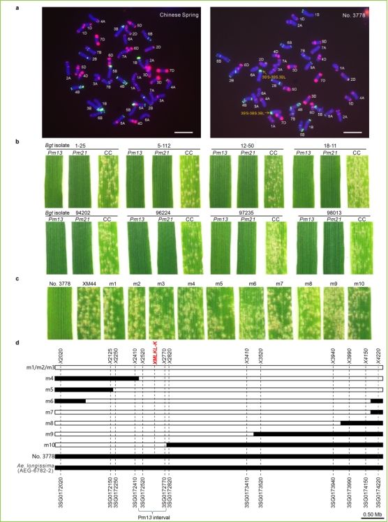白粉病是威胁我国小麦粮食安全的重要病害之一,挖掘和克隆抗白粉病基因进而提高小麦品种的抗白粉病能力是当前小麦抗病育种的重要任务。高大山羊草是小麦的一个野生物种,两者的远缘杂交后代中携带了抗白粉病基因Pm13,它对不同地区的白粉菌菌株具有良好抗性,然而交换抑制阻碍了该基因的克隆和育种利用。