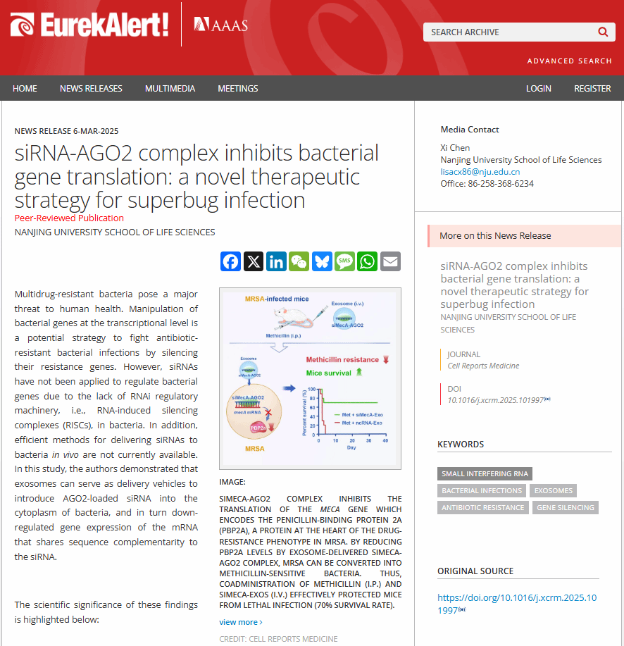 美国科学促进会(AAAS)主办的全球科技新闻网站EurekAlert以siRNA-AGO2 complex inhibits bacterial gene translation: a novel therapeutic strategy for superbug infection为题对该成果进行了报道。国内知名的医学类公众号BioArtMED也对该研究进行了解读报道。